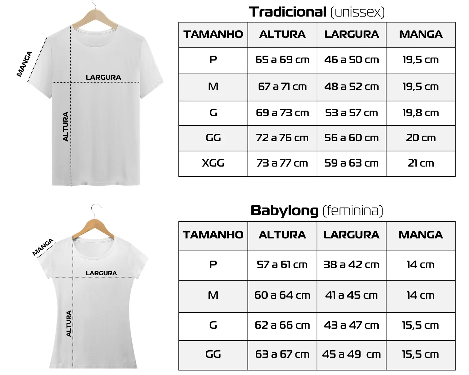 | Modelo | Baby Long (Feminina), Tradicional (Unissex) |